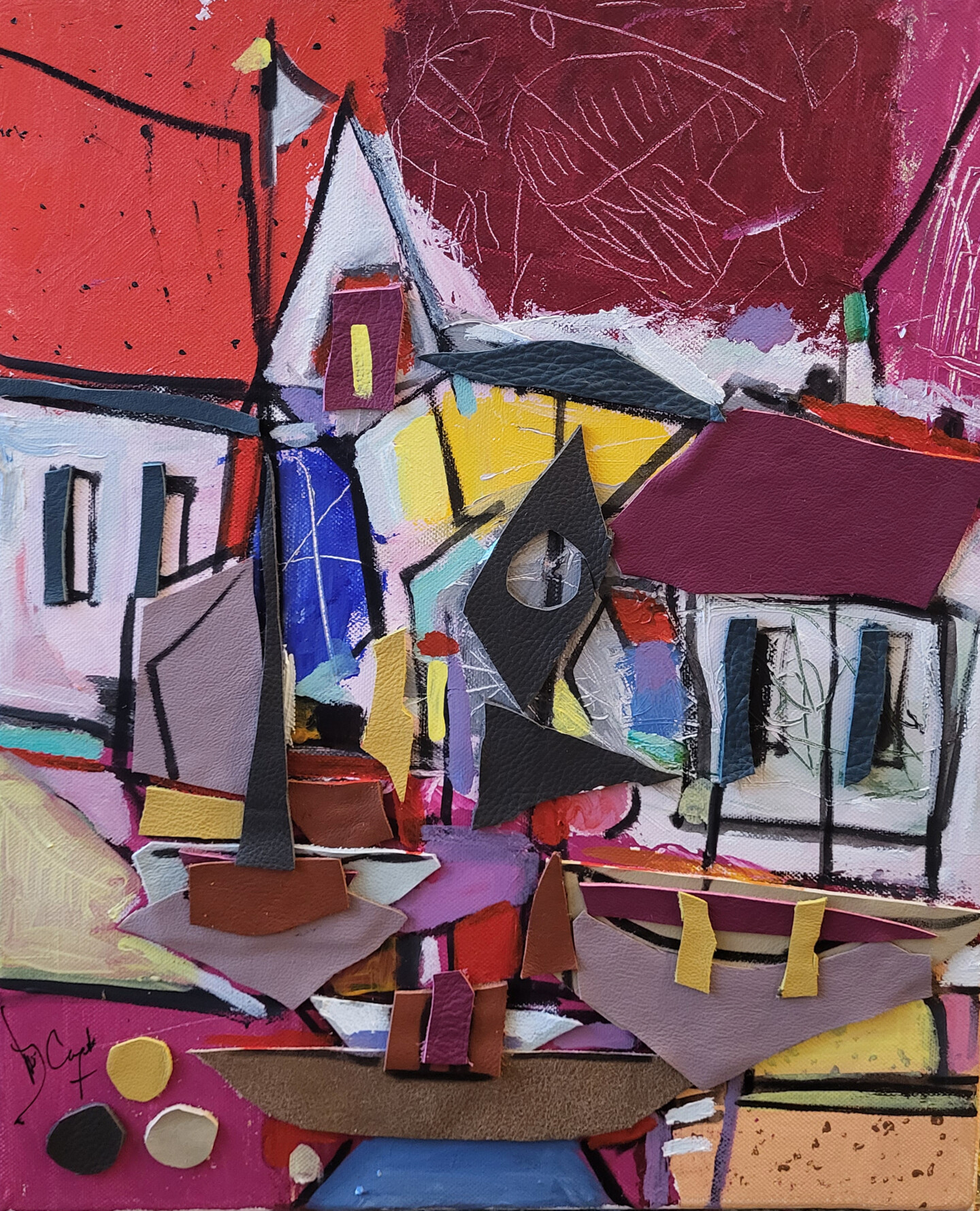 Acrylique + collage de morceaux de cuir sur toile